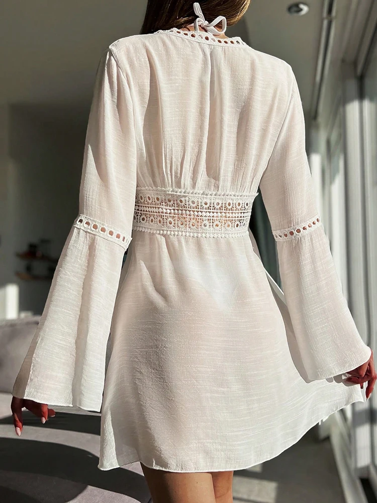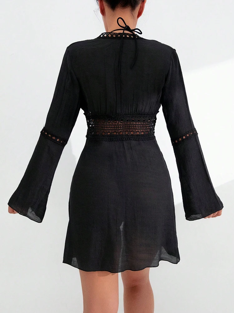 A chic and effortless long-sleeve cover-up perfect for a day at the beach or by the pool. This V-neck cover-up features a delicate crochet trim that runs along the neckline and forms a flattering waistband. Tassel ties at the front allow for an adjustable fit, while the flared sleeves add a touch of bohemian style. Made from a lightweight, breathable fabric, it’s the perfect finishing touch to any swimwear look.