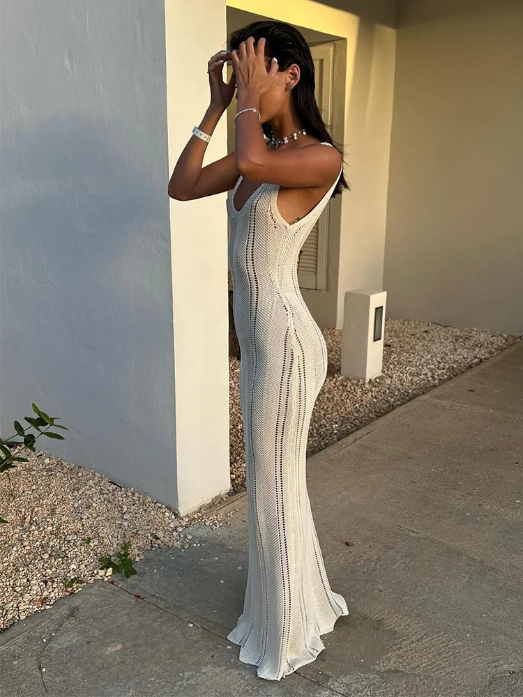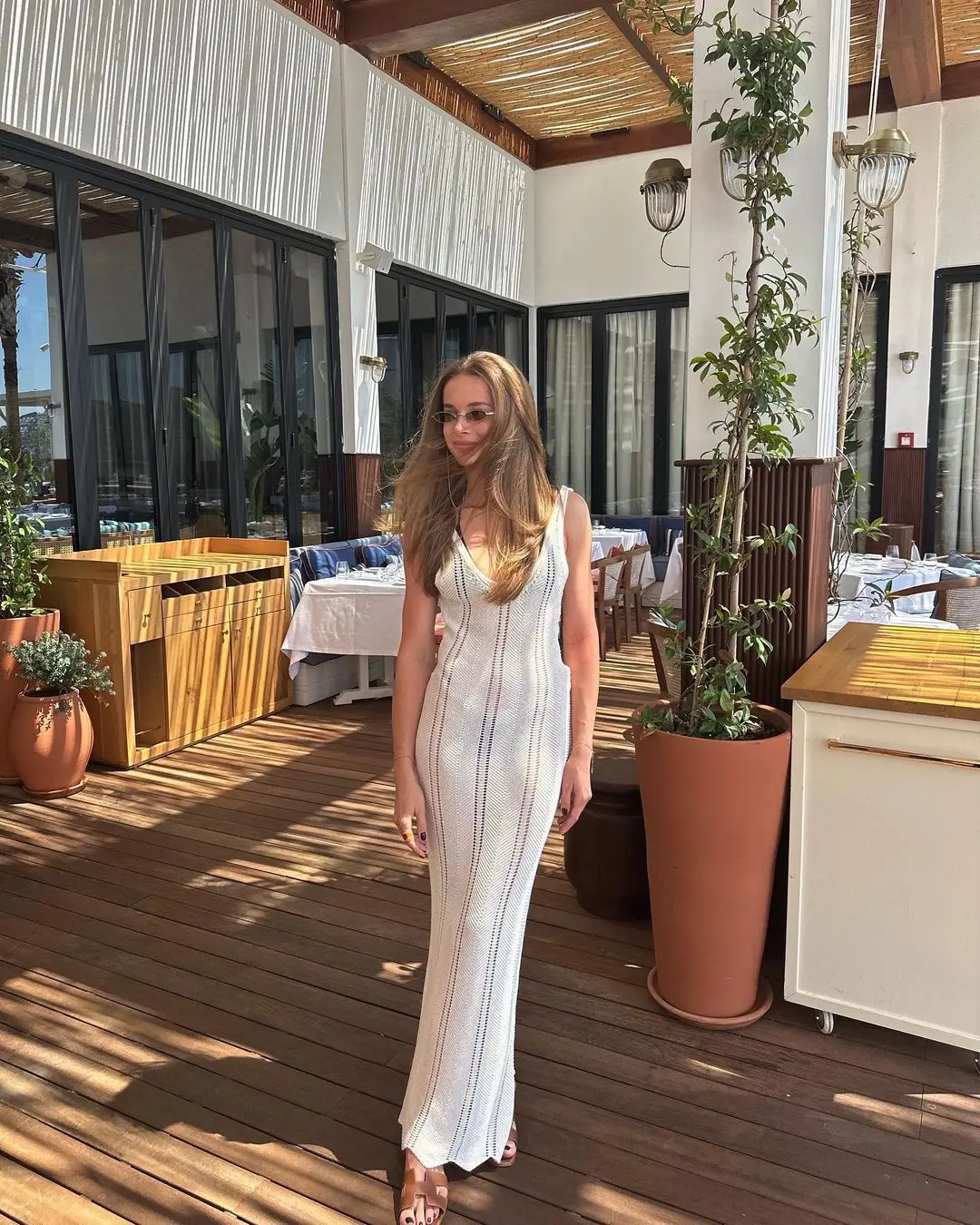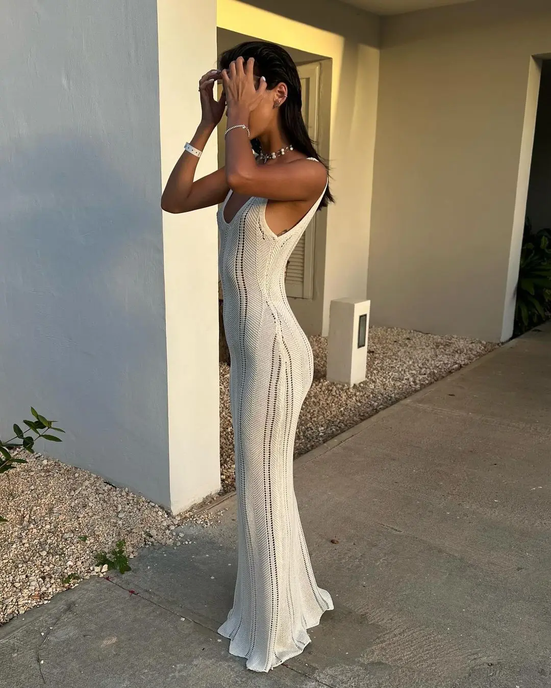 Show-stopping mini dress designed to turn heads. This dress features a unique halter neckline with a deep V-cut and stylish cutouts at the waist. The top and waistband are adorned with large, iridescent sequins that catch the light beautifully. The skirt is a sheer, net-like fabric with scattered sequins, adding a playful and glamorous touch.