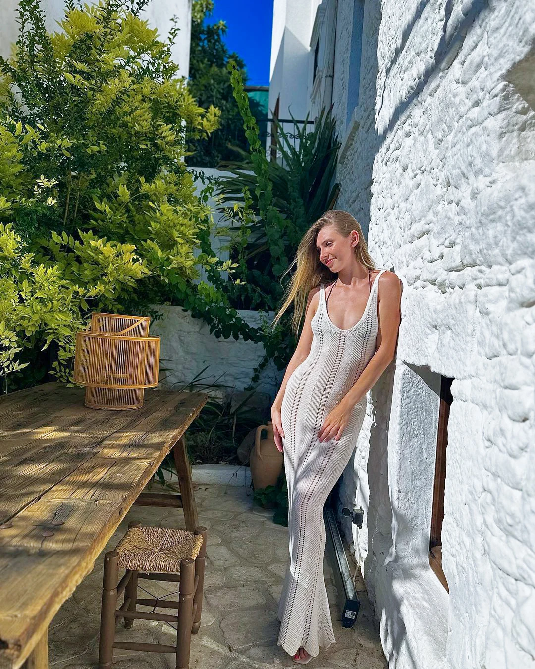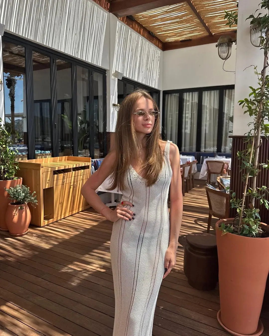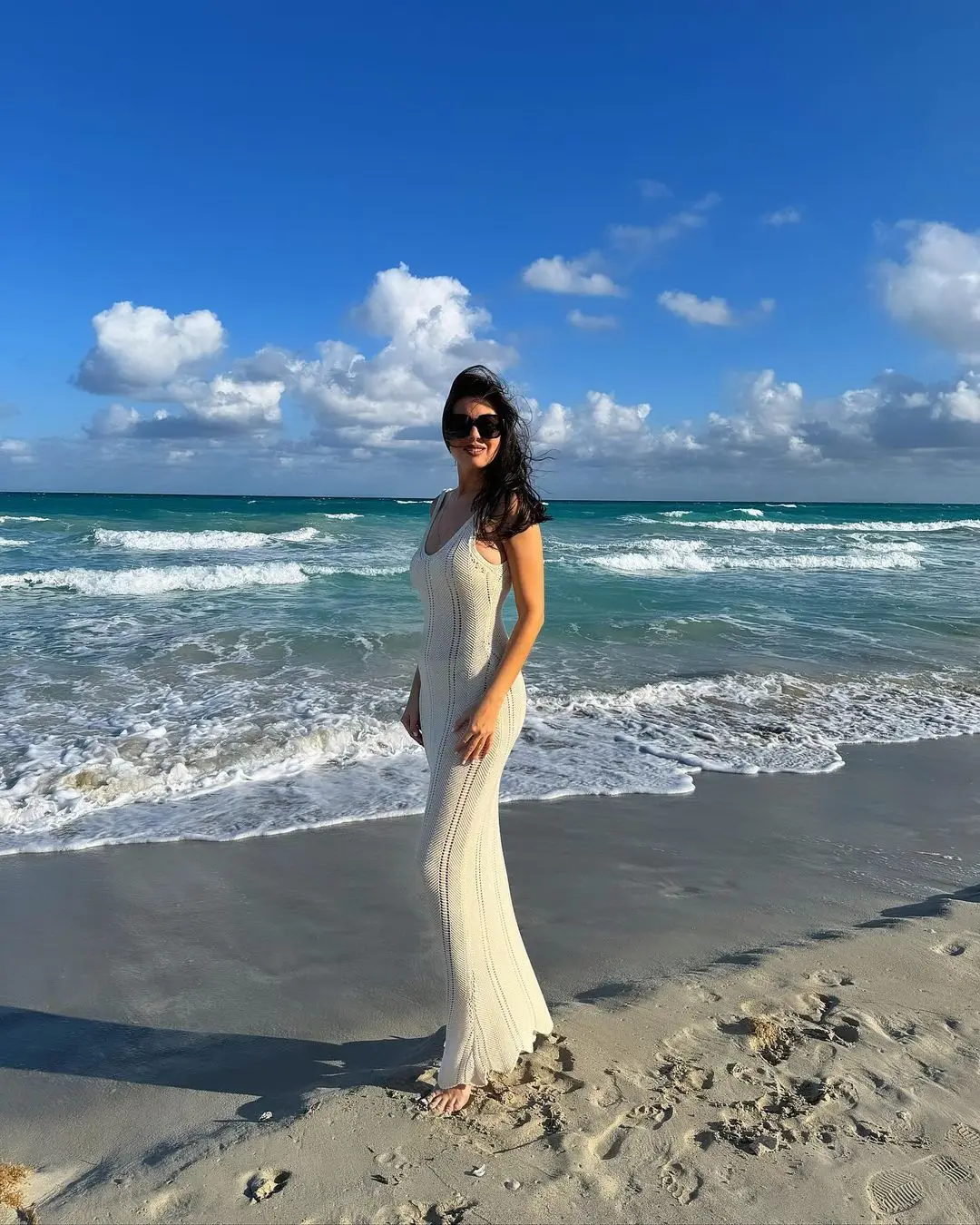 Show-stopping mini dress designed to turn heads. This dress features a unique halter neckline with a deep V-cut and stylish cutouts at the waist. The top and waistband are adorned with large, iridescent sequins that catch the light beautifully. The skirt is a sheer, net-like fabric with scattered sequins, adding a playful and glamorous touch.