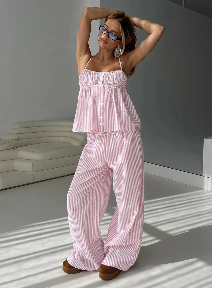 This two-piece set features a lightweight, striped cami top with a ruffled empire waist and a functional button-down front. The matching wide-leg pants offer a relaxed and flowy fit, making this set a dream for lounging at home or getting a peaceful night’s sleep.
